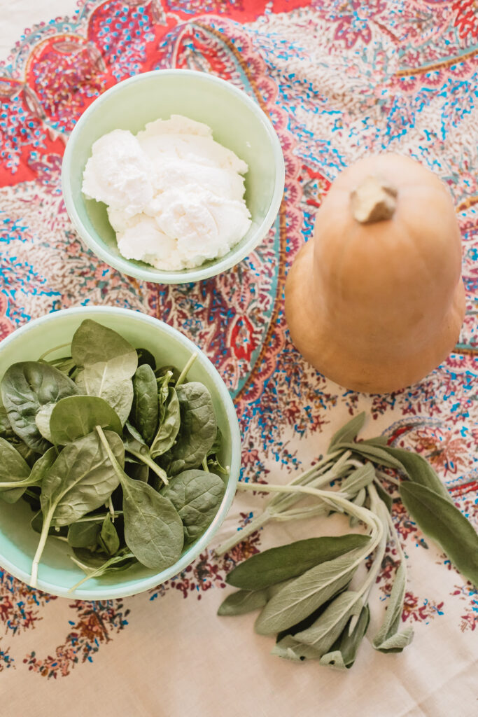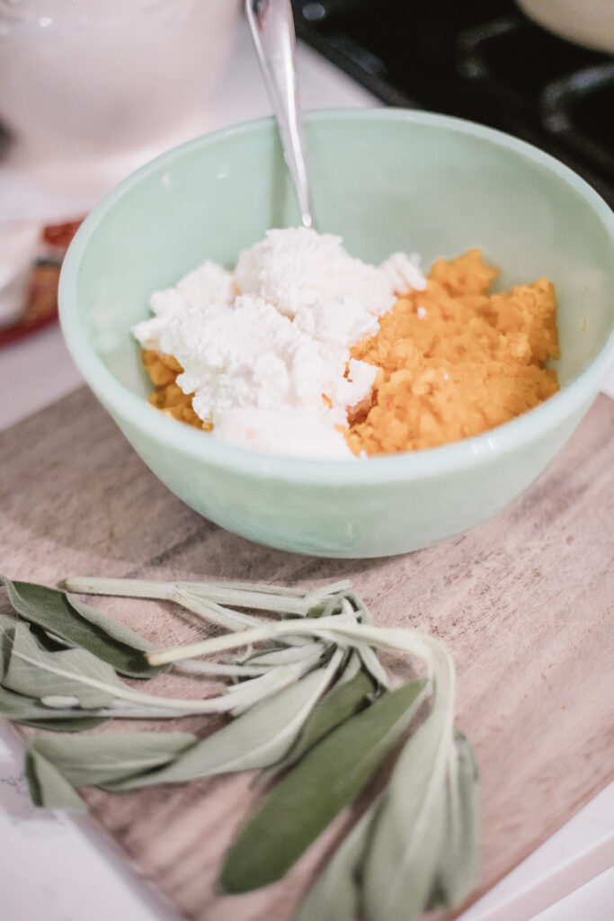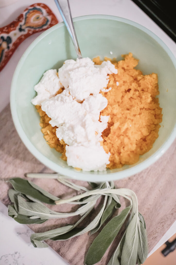 - In a medium bowl, combine butternut squash puree, 1 cup ricotta cheese, almond milk, nutmeg, cloves & sage.