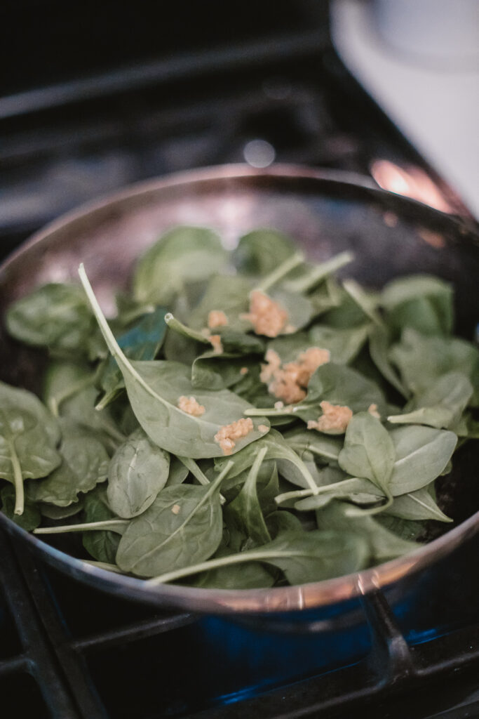 - Sauté olive oil, garlic and spinach in covered sauté pan until wilted.