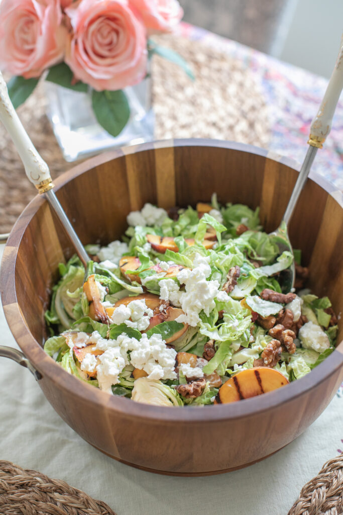 - Assemble your salad. Place marinated brussels sprouts in a large serving bowl {strain if needed}. Top with grilled nectarine slices, crumbled goat cheese, and toasted walnuts. Mix gently.
